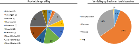 In onderstaande grafieken ziet u de actuele spreiding van de portefeuille. De linker grafiek toont de geografische spreiding over Nederland en de rechter grafiek de spreiding over de verschillende sectoren vastgoed. Hierin is het toegenomen belang van winkels zichtbaar. Het relatieve belang in kantoren is juist afgenomen.