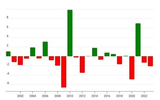 De grafiek hiernaast laat de jaarlijkse verandering van de groei van de Duitse economie zien tot en met 2023. De economische ontwikkeling in 2024 toont een vergelijkbaar beeld, waarmee ook in dat jaar sprake is van een krimp van de economie.